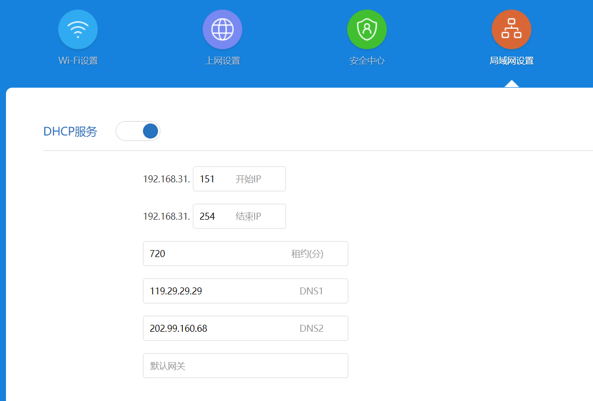 明白这些,就简单多了,登陆 Redmi AX5 网页后台,在DHCP参数页,设置一个或两个DNS为非192.168.31.1的IP就行了,当然把默认网关改成旁路由也可以,不过我不想那样。
