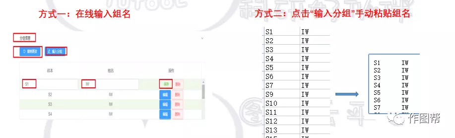 3.1 在界面右侧编辑分组信息:需要对所有样品进行分组,本网站支持在线修改分组名称的功能。有在线输入(方式一)和手动粘贴(方式二)两种方式。(绘图前必须检查分组名称)