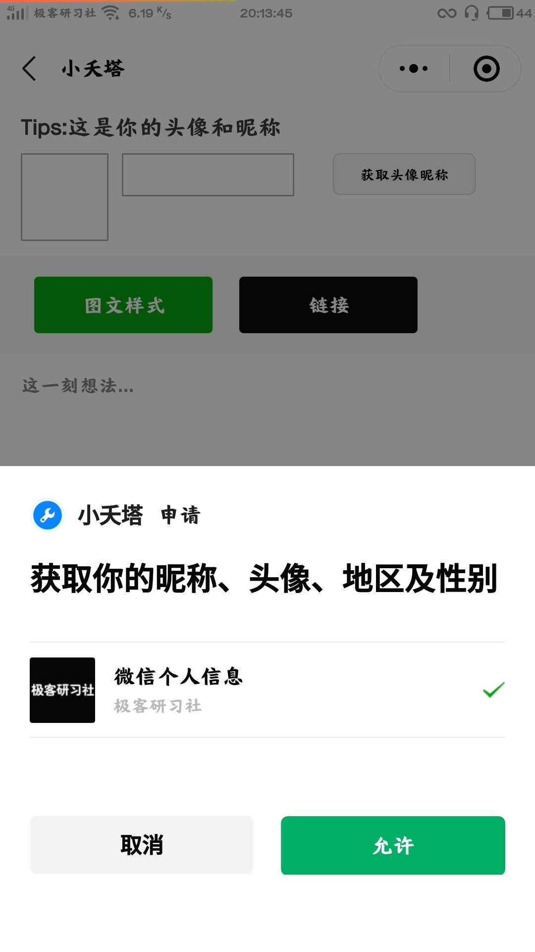 我们点击【获取头像昵称】会自动获取我们的昵称头像,出现获取个人信息的权限弹窗的时候,我们一定选择【允许】~