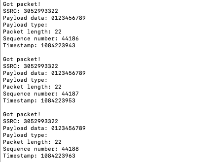 编译后运行如上,输入本地 UDP 使用的端口以及对端监听的端口,设置需要发送的 RTP 包数即可发送,发送后接收端打印的信息如下。