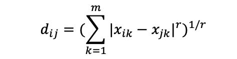 2.距离测度:在m维空间中定义点和点的距离,距离越近的点,相似程度越高,聚类时更可能归为一类。明可夫斯基距离是通用的距离测度公式 。