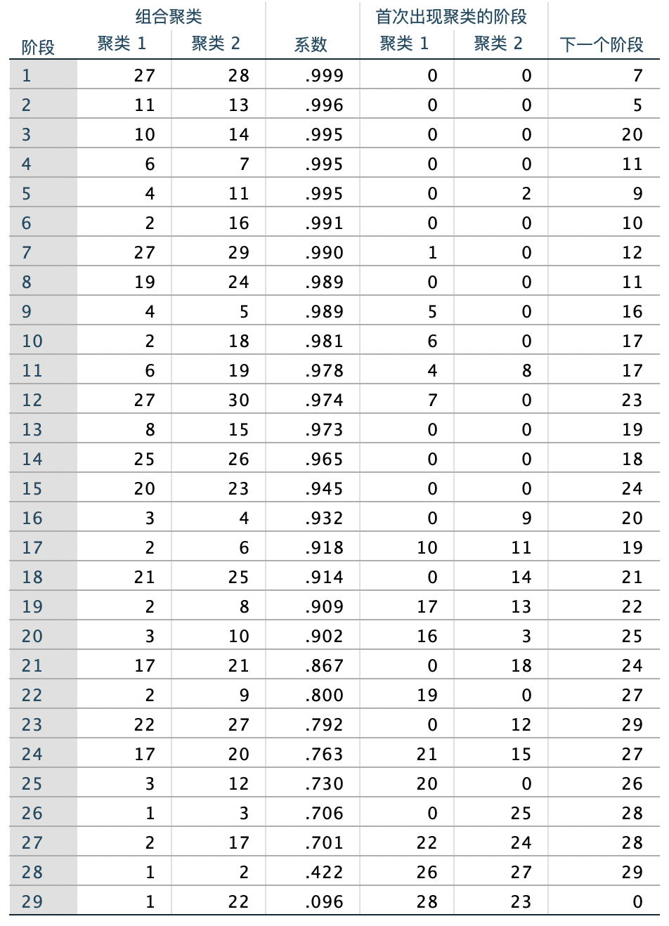 - 聚类进度表:第一列表示聚类的顺序,第二、三列表示每一步将哪两列合并,新合并的类的序号取两类中最小的;第四列表示被合并的两类之间的距离,也称为聚合系数(fusion coefficient),第五、六列表示被合并的两类上一次合并是在哪一步形成的。