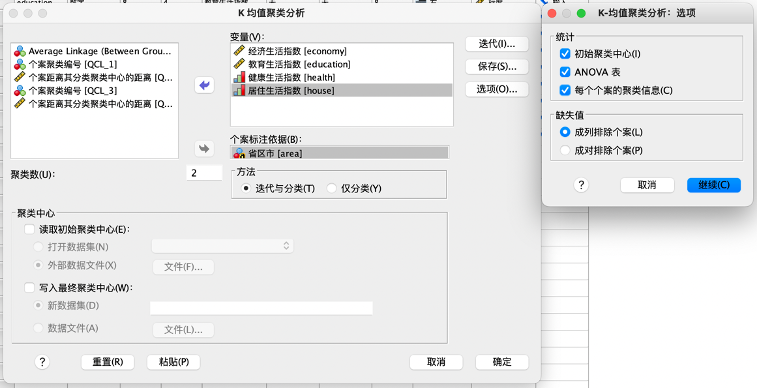 在“选项”窗口中,可以选择输出“初始聚类中心”“ANOVA表”(方差分析表)、“每个个案的聚类信息”。