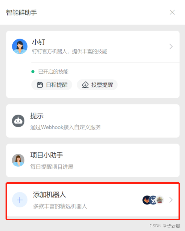 在钉钉创建一个群组并进入群设置→智能助手→添加机器人→自定义。