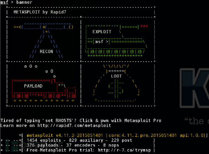 当打开msfconsole后,大家请看红色的方框。这里面清楚的标记了Metasploit所有的利用模块、payload、post模块等等。