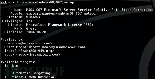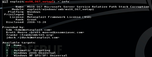 这个参数可以查看所在模块的信息,包括选项、利用条件、漏洞作者、可以利用的payload等等。
