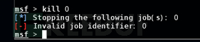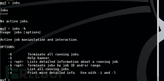 这个参数可以查看目前msfconsole上存在哪些任务,并且可以选择结束一些不需要的任务。如果要查看更详细的jobs选项,那么可以直接输入“jobs -h”进行查看。