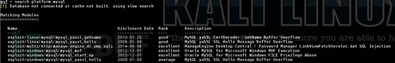 有时候我们会搜索到大量的模块,那么可以用platform:命令来缩小查询范围。使用platform命令后,所查询的结果会列出rank比较高的模块。如果我要查找mysql的漏洞,那么输入 “search platform:mysql”。大家对比一下上面的截图,发现没有,所有rank为normal的模块全部都屏蔽了,只剩下几个比较高级的利用模块。