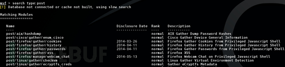 这里要使用到type:命令。Metasploit上只有三中模块可以利用,第一种是exploit模块,也就是利用模块。第二种是auxiliary模块。第三种是post模块。所以type命令也就只能搜索这个三种模块类型。如果我要搜索post模块,那么就输入“search type:post”: