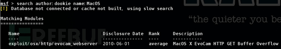 大家可以使用上面的参数自行搭配使用。如果我要查找dookie所写的MAC系统的漏洞模块。那么输入“search author:dookie name:MacOS”: