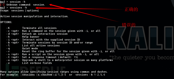 这个参数可以让大家能够交互,查询或者终止当前的一些会话。如果要查看session的选项,直接输入“sessions -h”即可。这里需要注意的是,命令是sessions,不是session。很多人都忘记后面那个s。