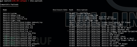 如果我进去了某一个利用模块后,要查看这个利用模块的可以加载的负荷就输入show payloads。这里大家自由发挥。